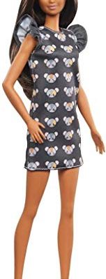 ​Lėlė Barbė yra aukštesnė už originalų kūną ir dėvi pilką suknelę su pelės raštu su rauktomis rankovėmis.