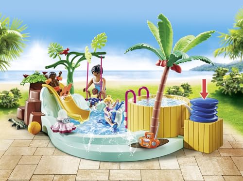 Linksmybės vandenyje: visos šeimos laukia smagi ir nepamirštamų įspūdžių kupina diena! Vaikai gali pramogauti baseine ant bangų čiuožyklos, mažylių sūpynės ir spyruoklinės sūpynės, o suaugusieji atsipalaiduoja jaukioje sūkurinėje vonioje